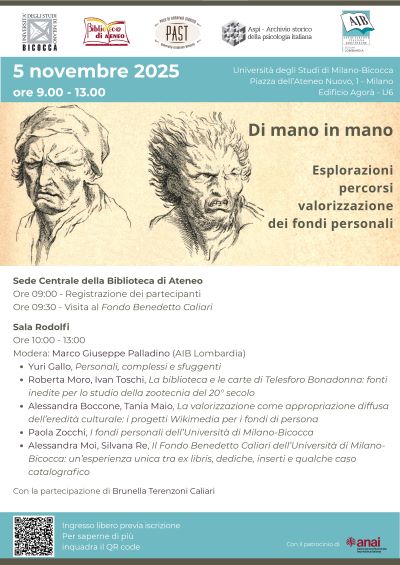 On 5 November 2025, from 9:00 to 13:00, the University of Milano-Bicocca will host a conference titled Di mano in mano: esplorazioni, percorsi e valorizzazione dei fondi personali (From hand to hand: explorations, paths and valorisation of personal collections). The event is organised by the University of Milano-Bicocca together with the Lombardy segment of AIB, the Italian Association of Libraries.